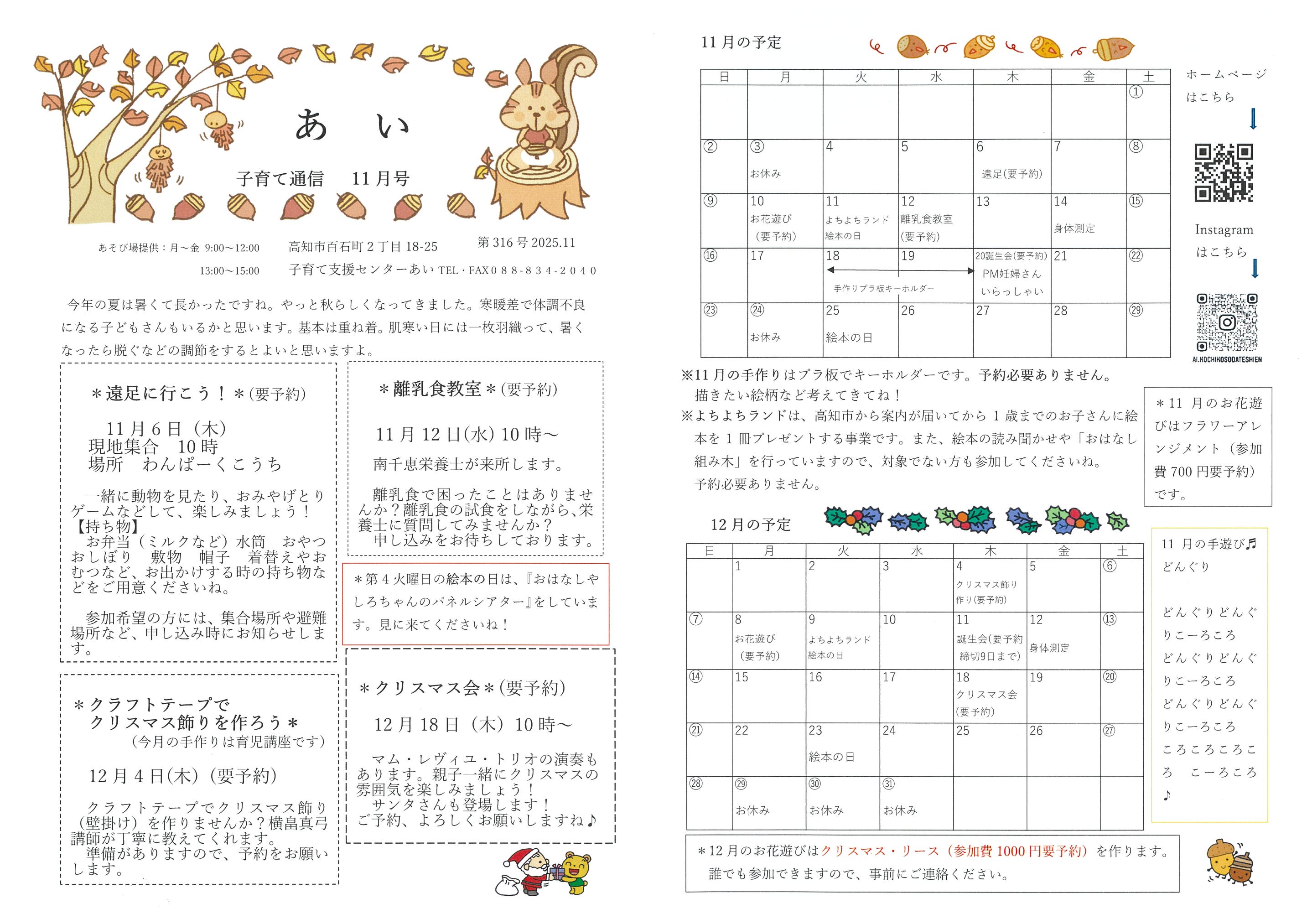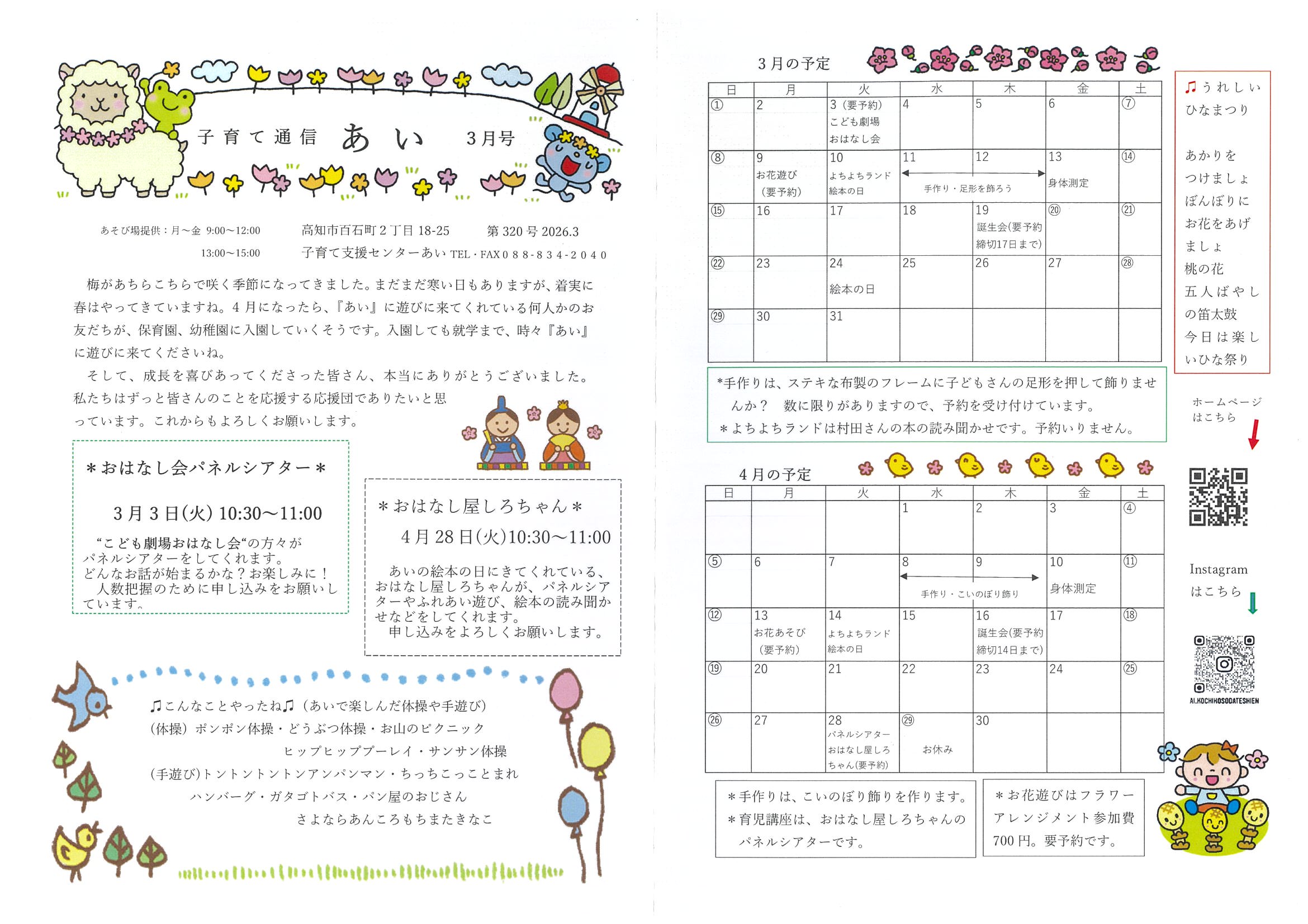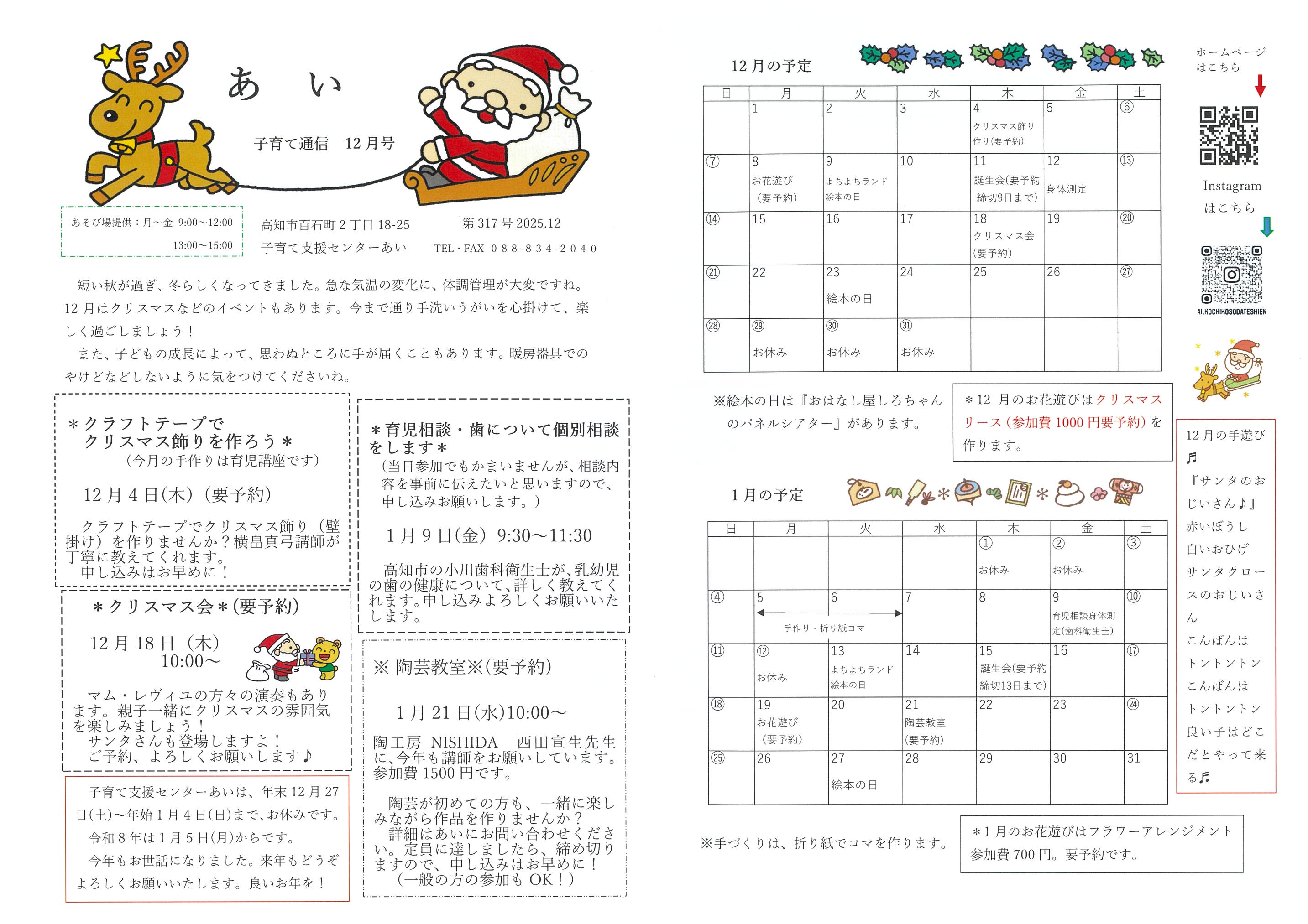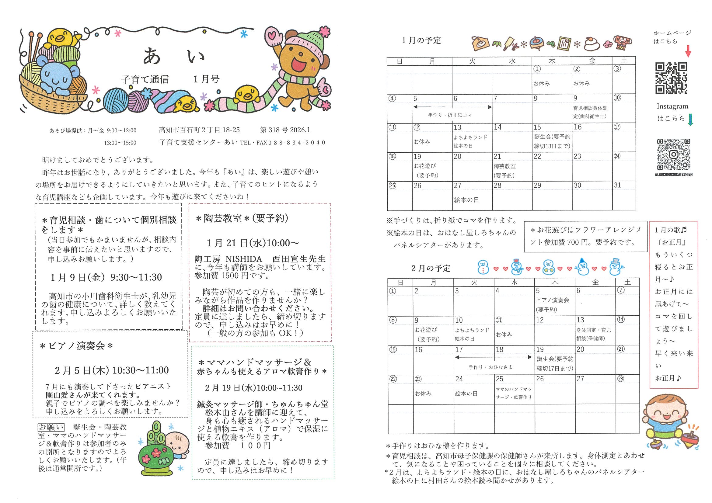 | 事業内容 | ①遊び場提供-なかよしルームには、沢山の遊具、絵本など子どもの喜ぶものがあります。 ご自由に遊んで下さい。お花あそび、誕生会、手づくり、絵本の日、身体測定など楽しい催しもあります。 毎日午前中に手あそび・ふれあいあそび、体操をします。 ②育児講座-子育てに関する話、健康に関する話、楽しい親子遊びなどの講座を企画しています。 ※人数把握のため申し込みが必要です。 ③育児相談-子育てのことなどいつでもお気軽にご相談ください。 ④情報提供-子育て通信「あい」を毎月発行。 その他、育児に関するいろいろな情報の掲示。 〇身体測定-毎月第2金曜日の午前中におこないます。9月・2月には保健師、6月・12月は助産師、1月は歯科衛生士が来所し相談を受け付けています。 〇お誕生日会-毎月第3木曜日にその月に生まれたお子さんのお祝いをします。午前中は、申し込みなさったお誕生月のお子様のみの参加となります。午後はご利用できます。 〇手づくりの日-簡単に作れる季節の飾りやおもちゃなど作ります。 〇妊婦さんいらっしゃい-年2回、助産師が来所して相談等受けています。お気軽に遊びにおいで下さい。 〇絵本の日(よちよちランド)-第2・第4火曜日絵本の読み聞かせを行います。みんなと一緒に絵本や大型絵本の読み聞かせを楽しみましょう。 第2火曜日はよちよちランドも同時開催 (1歳のお誕生日当日までのお子さんに絵本を1冊プレゼントする高知市の事業です) 案内文書が届きましたら引換券を持ってご参加ください